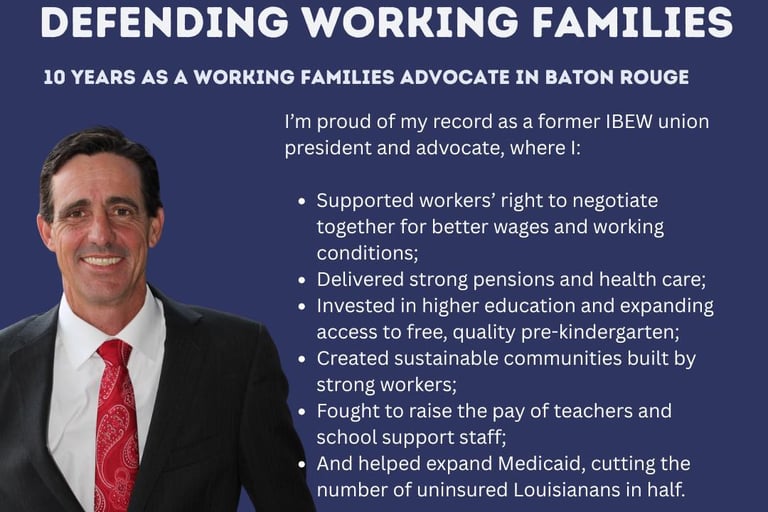 After Katrina, he took a job as an advocate for working families with the IBEW Local 130. Chad knows how hard it is to make a living on an hourly wage, so for nearly a decade he served as a tireless advocate to create Louisiana jobs.